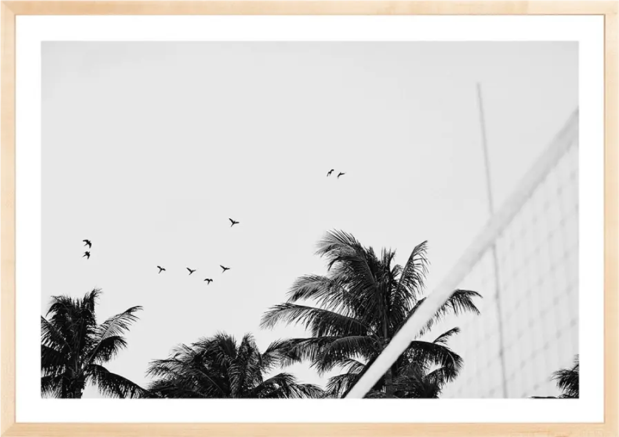 Silhouettes of terns browsing the iconic South Beach volleyball courts sky, framed by the palm trees off Ocean Drive. (Miami 001)